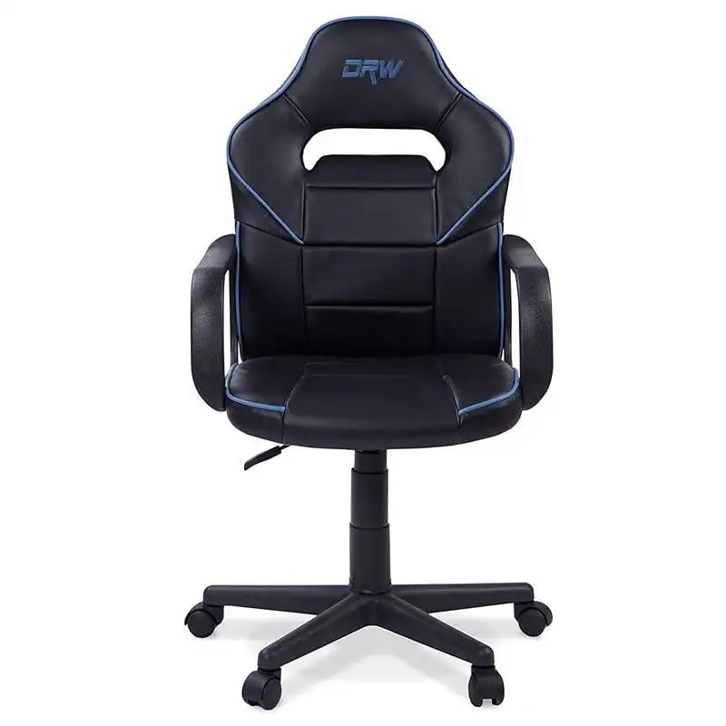 Silla gaming infantil Adec DRW fabricada en color negro con detalles en tono azul. Es regulable en altura y se adaptará a cualquier espacio. Características: Medidas de la silla DRW: 60 cm (ancho) x 98 - 108 cm (alto) x 45 cm (fondo). Silla de escritorio que encaja a la perfección en estudios despachos habitaciones juveniles oficinas... Sistema regulable en altura mediante pistón de gas se acciona con una palanca situada debajo del asiento. Podrás adaptar la silla a tus necesidades y ajustar la distancia óptima entre la silla y la mesa de escritorio. El respaldo y el asiento presentan un gran acolchado que te aportara comodidad están fabricados en símil piel de calidad color Negro y Azul. La silla incluye un mecanismo giratorio capaz de soportar 100kg de peso con sus cinco ruedas y el pie de estrella color Negro podrás conseguir un desplazamiento suave y ligero. El respaldo y el apoyabrazos son fijos aportando así una mayor estabilidad. Se limpia de forma fácil y rápida con un paño húmedo. Se envía sin montar...