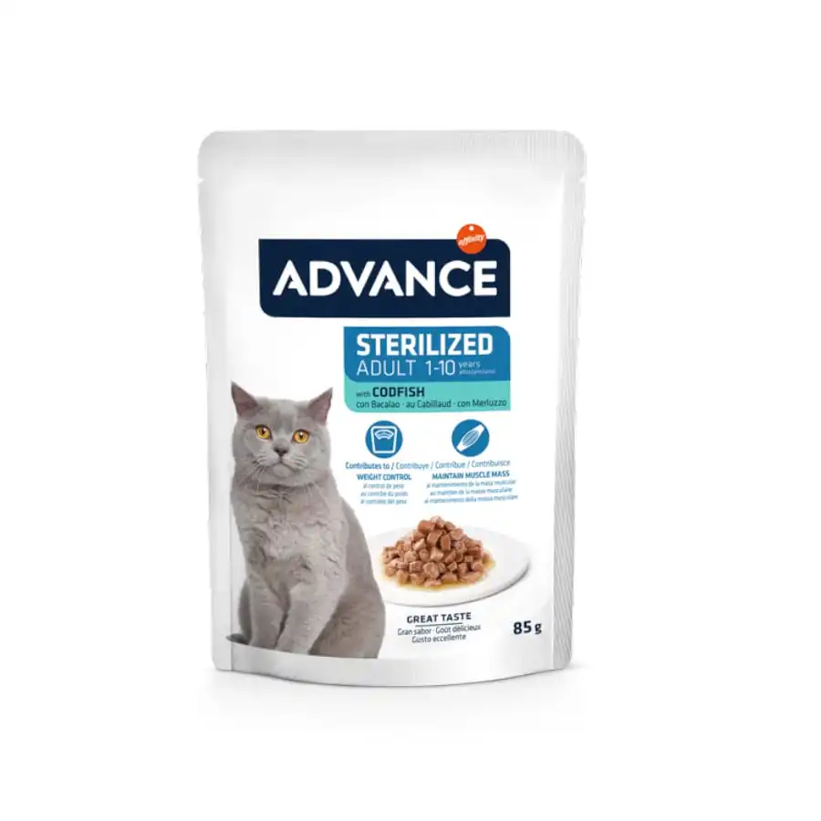 Comida húmeda para gatos esterilizados Advance Affinity Esta comida para gatos adultos castrados a partir de los 12 meses, incluye bocaditos de carne de bacalao en una jugosa salsa que será toda una tentación. Asimismo, incluye ingredientes Premium fáciles de digerir y una receta que cubre las necesidades alimenticias de tu amada mascota, como el mantenimiento de la masa muscular, la cual puede verse afectada después de la esterilización. Su rica textura en salsa le agradará a su paladar, además, vienen en sobres sencillos de servir en el comedero. Está formulado para mejorar el control de peso al tiempo que es muy delicioso gracias a sus proteínas, fibras, bajo contenido de grasas y minerales. Todo este alimento húmedo cuida también de la salud de tu mascota ya que no incluye conservantes ni colorantes. Características: Alimento especialmente para gatos esterilizados. Con alto contenido en proteínas que contribuyen al mantenimiento de la masa muscular. Mejora el sistema inmune. Con