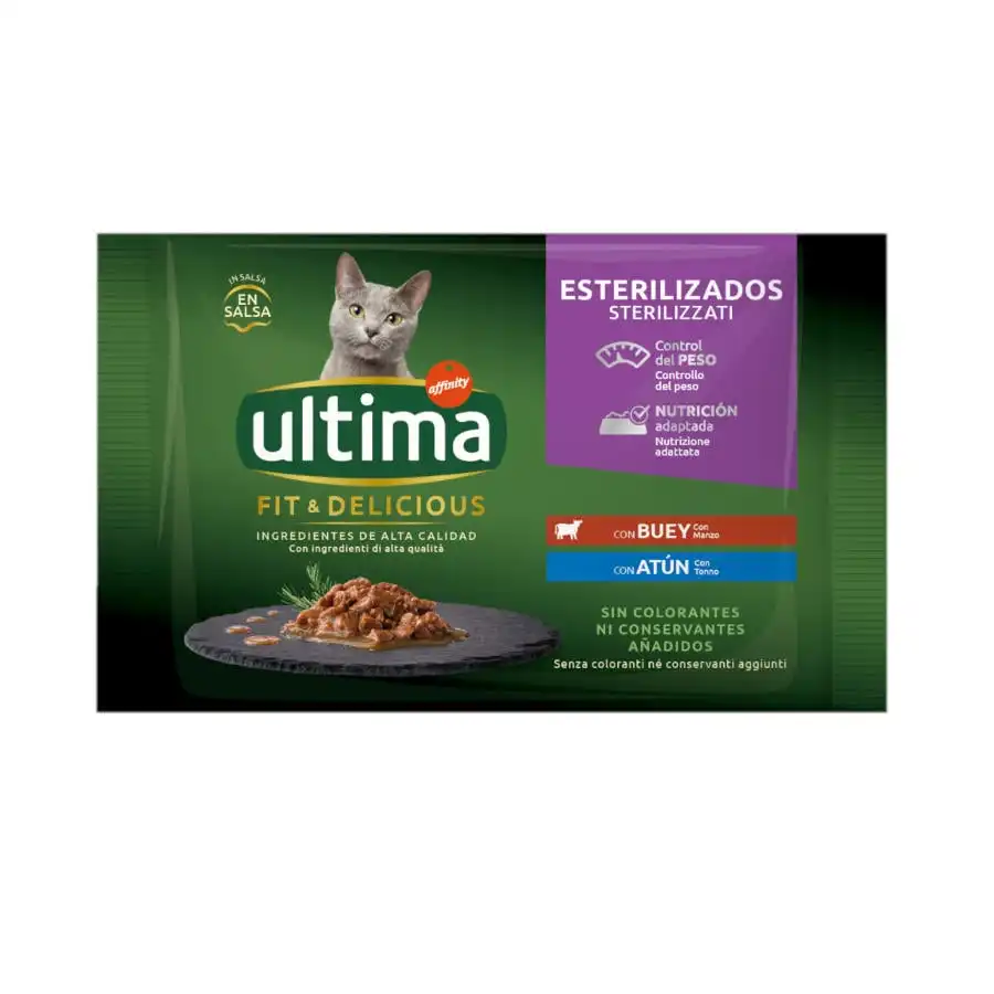 Multipack de comida húmeda para gatos esterilizados Ultima Fit & Delicious Ultima Fit & Delicious es la nueva gama de comida húmeda para gatos adultos esterilizados. Un multipack de recetas completas y equilibradas elaboradas con ingredientes de alta calidad y un increíble sabor. Para que tu gato siga comiendo con las mismas ganas de siempre y disfrute de diferentes menús cada día. Tras la esterilización, existe el riesgo de que tu gato empiece a coger unos kilos de más. Si has notado que ha empezado a engordar, puede deberse a esto. Su metabolismo ha cambiado y necesita un alimento adaptado a sus nuevas necesidades, que le ayuda a mantenerse en su peso ideal sin pasar hambre. Las recetas de comida húmeda Fit & Delicious son perfectas para tu felino: ofrecen una nutrición adaptada y ayudan a controlar el peso. De esta forma, tu gato no solo se mantendrá en una buena condición corporal sino que, además, seguirá teniendo la misma vitalidad y agilidad que antes. Menús hechos con tiernos y deliciosos trocitos de carne en salsa con un sabor y una textura irresistibles, y libres de conservantes y colorantes añadidos. Descubre los diferentes multipacks de carnes y pescados como pollo, cordero, salmón, trucha y ¡mucho más! VENTAJAS DE LA COMIDA HÚMEDA ULTIMA FIT & DELICIOUS: Alimento húmedo para gatos adultos esterilizados. Fórmulas completas y equilibradas. Elaborado con ingredientes de alta calidad. Nutrición adaptada. Ayuda al control de peso. Mantiene la agilidad. Sin conservantes ni colorantes añadidos. Disponible en una gran variedad de sabores. USO Y ESPECIFICACIONES: Alimento húmedo completo y equilibrado para gatos adultos esterilizados indicado para el control de peso. Descripción nutricional: Con buey: Carnes y subproductos animales (4% de buey), subproductos de origen vegetal (0,4% de pulpa de remolacha), sustancias minerales. Con atún: Carnes y subproductos animales, pescados y subproductos de pescado (4% de atún), subproductos de origen vegetal (0,4% de pulpa de remolacha), sustancias minerales. Constituyentes analíticos: Proteína bruta 8,5%, grasa bruta 4%, fibra bruta 1,1%, ceniza bruta 1,8%, humedad 82%. Aditivos nutricionales (por kg): Vitamina D3 200 UI, Vitamina E 100 UI, Taurina 100 mg, L-carnitina 95 mg, Biotina 100 μg, Sulfato de manganeso monohidratado 9,2 mg (Mn: 3 mg), Sulfato de zinc monohidratado 55 mg, (Zn: 20 mg). Energía metabolizable 770 kcal/kg. Dosificación: Peso del gato Bolsitas al día 2 kg 2 4 kg 3 6 kg 3 1/2 8 kg 4 1/2 Formato: 4 x 85 g A partir de la fecha en que recibas tu producto, se garantiza un plazo de 3 meses antes del vencimiento de su fecha de caducidad, o de 1 mes en el caso de los productos lácteos y el pienso ecológico.