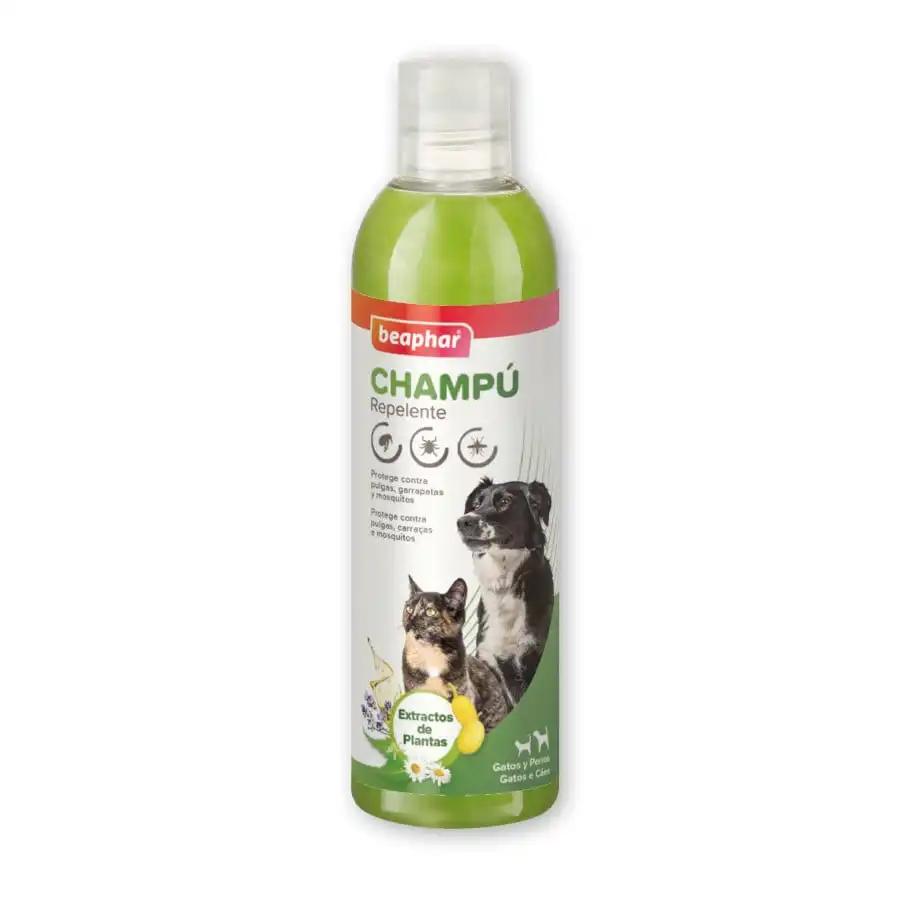 Champú con efecto repulsivo contra pulgas, garrapatas y mosquitos para perros y gatos El champú para perros y gatos de Beaphar es ideal para ofrecer a tu mascota un producto que garantiza una buena limpieza y mantiene la higiene para que se mantenga en un estado óptimo de salud. Promueve un efecto repulsivo contra las pulgas, garrapatas y mosquitos haciendo que tu peludo amigo goce de mayor seguridad y comodidad. Además, es apto para todo tipo de pelaje, respeta el pH neutro de la piel de tu perro o gato y su aplicación es segura. Este producto de Beaphar está elaborado con extractos naturales como piretro vegetal, un extracto natural de una planta herbácea del género del crisantemo que contiene efectos repelentes de insectos, el extracto natural de Margosa presenta acción contra pulgas, garrapatas y mosquitos, y también contiene lavandín que desprende un agradable aroma a lavanda y tiene efectos repelentes contra los insectos. Un champú fenomenal para mantener la buena salud de tu