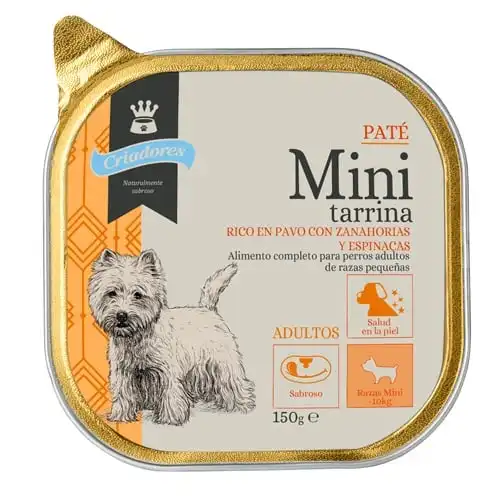 Tarrina de Paté Criadores para perros de razas pequeñas La Mini tarrina Paté Criadores Pavo, zanahorias y espinacas es un alimento húmedo para perros adultos a partir de los 12 meses de edad. Se trata de una receta completa y equilibrada elaborada con ingredientes seleccionados para cuidar la salud de tu peludo. Su fórmula está especialmente diseñada para los perros de raza pequeña, de menos de 10 kg de peso. Esta deliciosa tarrina de paté ofrece a tu perro una comida de verdad, nutritiva y saludable. Pero, además, es naturalmente sabrosa para que disfrute más que nunca con su menú diario. Está elaborada con un 30% de pavo y otras carnes y pescados. Para mejorar la receta y hacerla mucho más completa, añade zanahorias y espinacas, así como aceite de salmón. La combinación de estos ingredientes en una suave textura de paté hace que los perros no puedan resistirse a su sabor. La tarrina de Paté Criadores Mini para perros de raza pequeña es de fácil digestión. También promueve la salud de la piel gracias al aporte de ácidos grasos esenciales y el zinc. Además, está enriquecida con vitaminas y minerales para fortalecer el sistema inmune. Las tarrinas tienen diferentes recetas para que puedas ofrecer un sabor diferente cada día: pavo con zanahorias y espinacas, ternera con cordero y manzanas y conejo con patata y pasta. Y si tu perro es aún cachorro, elige el paté de pollo y arroz, para perros de menos de 12 meses. VENTAJAS DE LA TARRINA PATÉ CRIADORES MINI: Alimento húmedo para perros de raza pequeña. Receta completa y equilibrada. Ingredientes seleccionados. Con un 30% de pavo. Libre de cereales. Añade aceite de salmón, rico en ácidos grasos. Enriquecido con vitaminas y minerales. Favorece una digestión saludable. Cuida la piel. Paté naturalmente sabroso. USO Y ESPECIFICACIONES: Tarrina de paté completo para perros adultos de todas las razas partir de los 12 meses de edad. Descripción nutricional: Ingredientes: carnes y subproductos animales (pavo 30%), pescados y subproductos de pescado, verduras (zanahorias 4%, espinacas 4%), sustancias minerales, aceites y grasas (aceite de salmón 0,4%). Constituyentes analíticos: proteína bruta 9,5%, grasa bruta 6%, fibras brutas 0,3%, ceniza bruta 2,2%, humedad 82%. Aditivos nutricionales (por kg): Vitamina D3: 140 UI, (3b605) Zinc: 12 mg (como sulfato de zinc monohidratado), (3b502) Manganeso: 1 mg (como óxido manganoso), (3b405) Cobre: 0,5 mg (como sulfato de cobre (II) pentahidratado), (3b202) Yodo: 0,3 mg (como yodato de calcio anhidro). Dosificación: Peso del perro Cantidad diaria recomendada 5 - 10 kg 300 - 500 g 10 - 20 kg 500 - 800 g 20 - 30 kg 800 - 1200 g Formato: Tarrina de 150 g Las tarrinas de paté Criadores Mini tienen un irresistible e intenso sabor a carne y una textura jugosa a la que tu perro no se podrá resistir. "