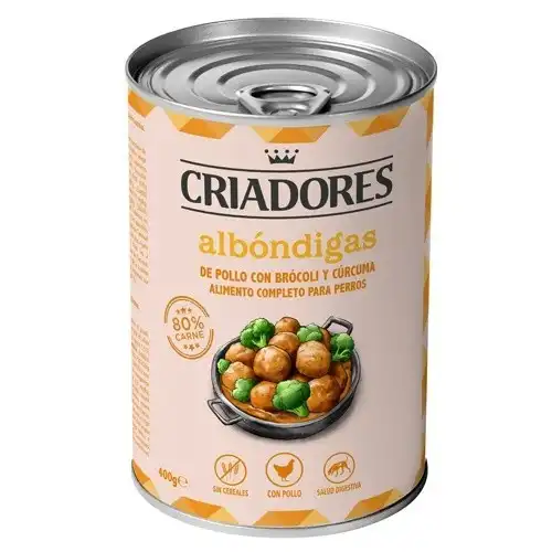 Albóndigas Criadores para perros Este producto de Criadores es una comida húmeda para perros adultos, viene en una lata donde contiene unas exquisitas albóndigas de sabor a pollo con brócoli y cúrcuma que les fascinará a tu mejor amigo peludo. Están bañadas en salsa para incentivar su sabor y activar las papilas gustativas de tu mascota. Sus ingredientes son de alta calidad y poseen un sin fin de beneficios para tu gran amigo, como, fibras, vitaminas, minerales y un efecto anti-inflamatorio. Además, ayuda a prevenir la diabetes, mejora su digestión y apoya su sistema inmunitario. No posee cereales ni gluten en sus componentes por lo que lo hace adecuado para aquellos caninos que sufran de alergias o intolerancia en la alimentación. Características: Comida húmeda para perros adultos. Ayuda a prevenir la diabetes en tu mascota. Mejora la digestión de tu gran amigo. Apoya a el sistema inmunitario de tu canino. Posee un efecto anti-inflamatorio. No tiene cereales ni gluten en sus