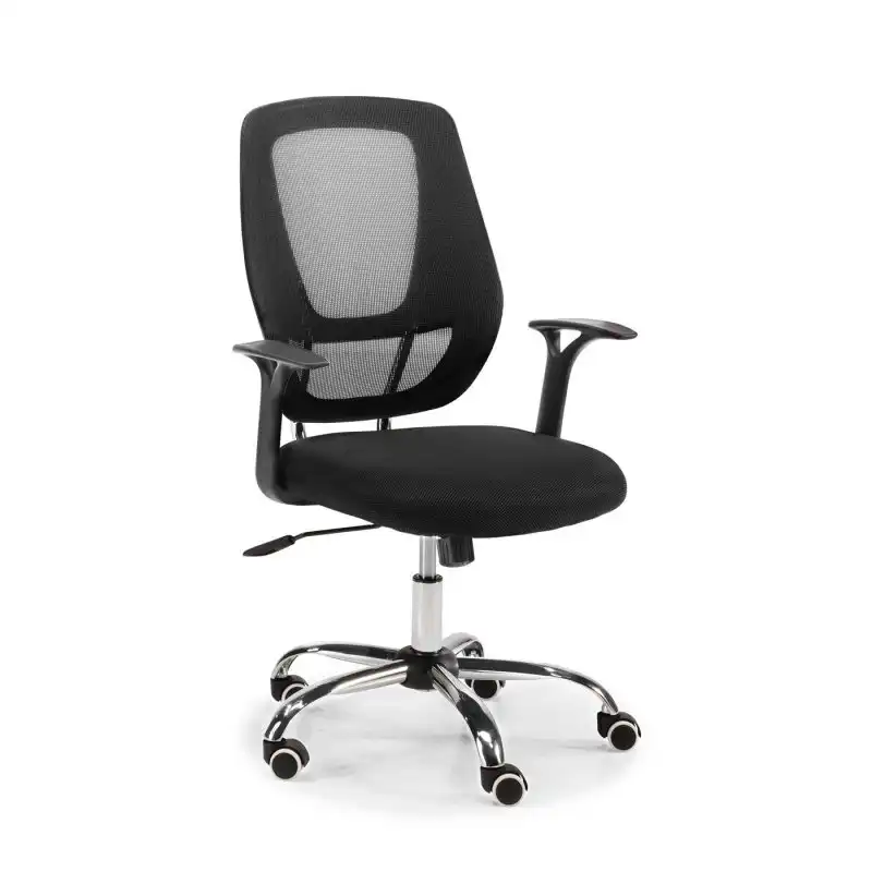 La silla de oficina Euromof Genova es una opción de esmeradas terminaciones a un precio competitivo. Cuenta con un respaldo alto de malla transpirable basculante y con base de acero cromado. Características Mecanismo Basculante: Permite balancear. El ángulo entre el asiento y el respaldo es siempre el mismo. Se puede fijar en la posición más adelantada para trabajar comodamente. Respaldo de malla transpirable y ultra-resistente de color negro. Elevación a gas. Brazos fijos en forma de T fabricados en polipropileno color negro. Base con 5 radios de acero cromado y ruedas con rodadura de goma. Asiento relleno de goma flexible de alta densidad. Tapizado en asiento transpirable. Colores: Asiento respaldo y carcasas color negro. Base y estructura cromado. Especificaciones Euromof Genova Ancho total: 64 cm Ancho asiento: 49 cm Alto total: 97 > 105 cm Alto asiento: 42 > 50 cm Fondo asiento: 50 cm Diámetro de la base: 63 cm
