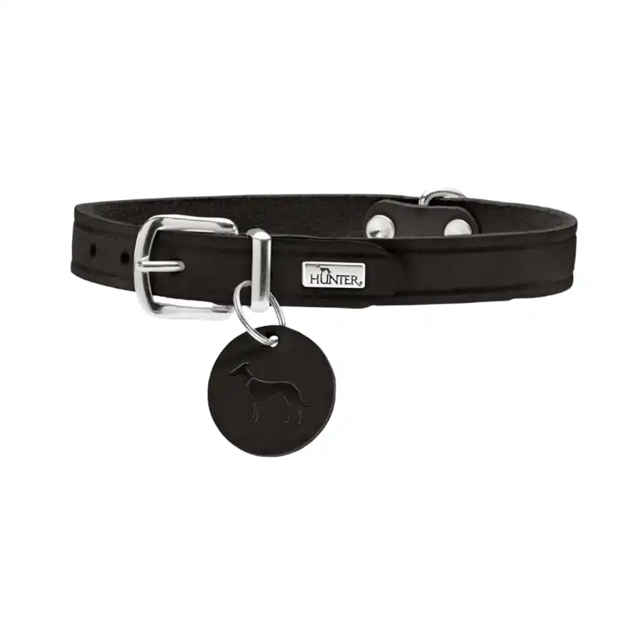 Collar de cuero duro y resistente para perros Si tu peludo amigo es de esos que realiza diferentes actividades deportivas y quieres colocarle un accesorio altamente resistente que le haga lucir diferente, debes colocarle el collar para perros Aalborg de Hunter. Cuenta con una elaboración de cuero vacuno auténtico que, gracias una aplicación especialmente abundante de aceite, resiste grandes esfuerzos, ideal para tu mascota que realiza deportes caninos. Incluye un cierre de hebilla metálica resistente para evitar que se abra accidentalmente y una anilla metálica para enganchar la correa y disfrutar de unos paseos seguros. También se puede colocar para uso diario gracias a su diseño elegante de color negro que lucirá estupendamente en su cuello e incluye un llavero de cuero fenomenal. El cuero de vacuno es especialmente suave, fabricado con la mayor delicadeza posible para otorgar a tu mascota un accesorio cómodo, duro y resistente. Este collar para perros de Hunter está elaborado con
