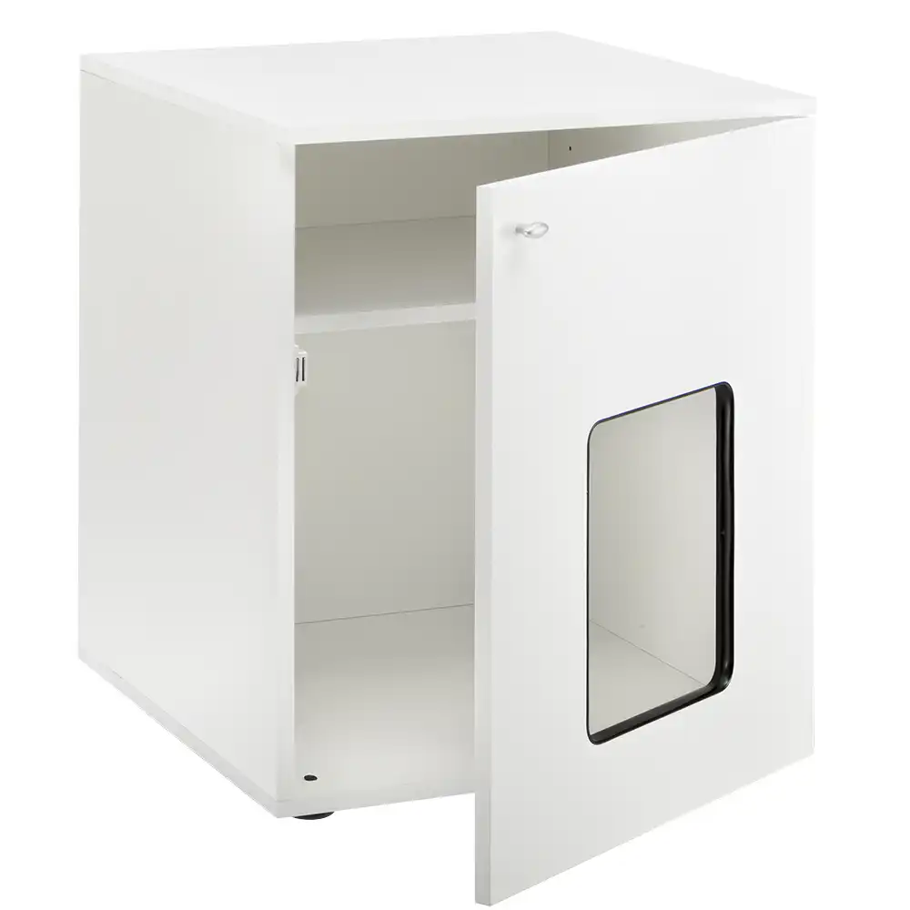 Con este precioso armario podrás mantener oculta la bandeja higiénica de tu minino. Este accesorio tiene un orificio por el que tu gato podrá entrar o salir. Este no se hará daño cuando intenta acceder al interior armario, ya que los bordes del orificio de entrada se encuentran revestidos con goma. El armario incluye una balda para guardar accesorios a la que puedes regularle el tamaño o quitar directamente para disponer de más espacio dentro del armario. Con este maravilloso armario podrás mantener tu casa siempre ordenada, ya que nadie se percatará del arenero que hay en el interior de este bonito armario. También lo podrá utilizar para esconderse y relajarse, como si se tratase de una cueva. No te preocupes por el montaje, ya que con el envío vienen incluidas unas instrucciones que te facilitarán la tarea, así como 4 patas de altura regulable y unos tornillos. Este producto de gran calidad se ha elaborado en Europa. ¡Un accesorio indispensable para cualquier hogar con gato!...