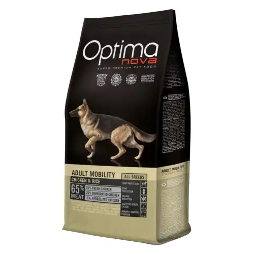 Pienso para perros Optima Nova Adult Mobility Un alimento de calidad premium para perros con problemas en las articulaciones, limitaciones de movilidad o displasia de cadera. Si quieres mantener a raya la movilidad de las articulaciones de tu mascota después de una displasia o por cualquier otra dolencia, el pienso Optima Nova Adult Mobility será tu mejora aliado. El secreto de esta comida para perros con problemas de movilidad no es otro que sus ingredientes: 100% naturales, sin conservantes ni colorantes artificiales y un 65% de carne de pollo. Además, los componentes con los que está enriquecida la receta aportarán a tu mascota grandes beneficios. Los ácidos grasos Omega 3 y 6 tienen un gran efecto antiinflamatorio, para proteger sus articulaciones y retrasar su desgaste, mientras que la glucosamina y la condroitina contribuyen a que las articulaciones tengan una correcta lubricación. La vitamina D, por su parte, es vital para la absorción de los minerales, y la L-Carnitina ayuda a
