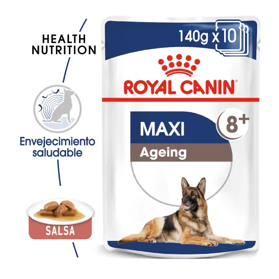 Perros Comida húmeda Royal Canin Maxi Ageing 10x140 gr Comida humeda para perros, que contiene EPA, DHA y un complejo exclusivo de antioxidantes para neutralizar los radicales libres. Ayuda a mantener la salud osteoarticular de los perros sénior de razas de tamaño grande. Favorece la salud digestiva y el equilibrio de la flora intestinal.