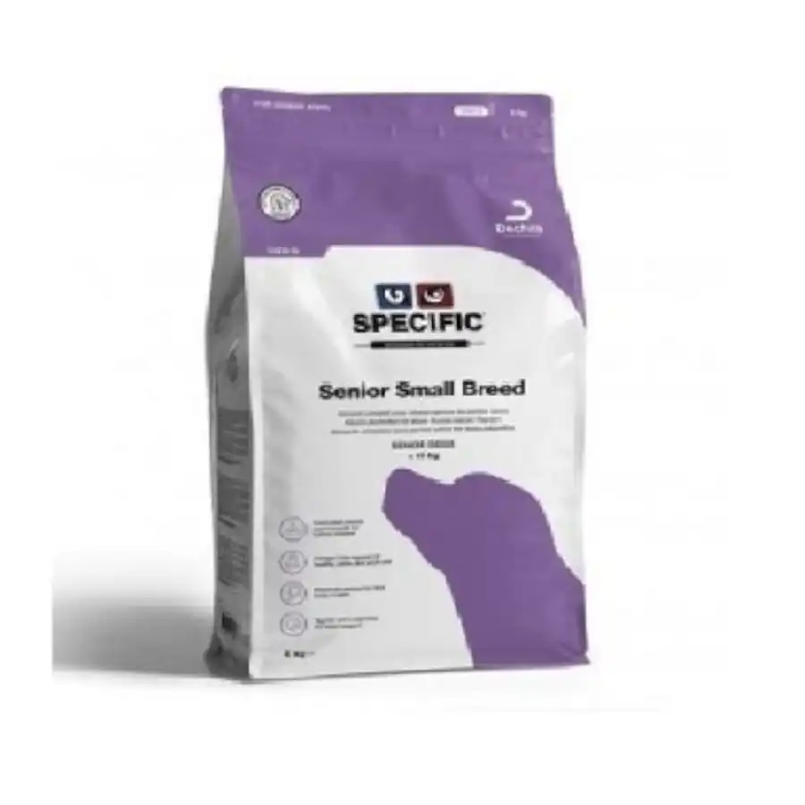 Alimento seco para perros mayores de razas pequeñas de menos de 10 kg Specific Senior es un pienso para perros mayores de razas pequeñas, posee una fórmula completa y equilibrada que garantiza una vejez óptima. También, es rico en fibra para ayudar a la digestión de tu perro pequeño. Es rico en omega 3 de pescado para una piel y articulaciones fuertes. También contiene L carnitina, un aminoácido que quema grasas. El uso de proteínas altamente digestibles como el pescado les permite digerir los alimentos incluso con los sistemas digestivos menos eficientes de los perros mayores. Pulpa de remolacha como fuente de fibras fermentables para apoyar la microflora beneficiosa para la salud intestinal. Esta comida de perros yuda a mantener un cuerpo saludable y peso ideal ya que es bajo en calorías y alto en fibra, este es un alimento menos denso en energía. Es decir, pueden comer su cantidad habitual, para no sentir hambre, mientras controlan el peso. Esta fórmula contiene reducción de proteínas, fósforo y sodio para disminuir la carga de trabajo en los riñones. Se agregaron taurina y L-carnitina que promueven la función del músculo cardíaco, es una ayuda nutricional para ralentizar o prevenir enfermedades geriátricas en perros de edad avanzada. Características: Aporta protección renal, reduciendo las probabilidades de progresión de la insuficiencia renal en perros mayores. Las proteínas de gran valor biológico garantizan la cantidad suficiente de aminoácidos esenciales para nuestra mascota. Mantiene piel y articulaciones sanas, niveles elevados de ácidos grasos omega 3 (EPA y DHA) garantizan una óptima salud del pelaje y las articulaciones para una movilidad articular normal. Ayuda a mantener el peso ideal, reduciendo el riesgo de obesidad y garantizando un adecuado aporte de nutrientes. Previene problemas de estreñimiento. Contiene MOS que favorece el desarrollo de la flora bacteriana, evitando el sobre crecimiento de bacterias patógenas causantes de trastornos en los perros ancianos. Posee taurina para un buen funcionamiento cardíaco, ayuda a trabajar al miocardio y mantiene la función del músculo cardíaco en animales ancianos. También interviene en muchos otros procesos metabólicos. Refuerza el sistema inmunitario, contiene beta-1, 3 / 1,6-glucanos procedentes de las levaduras que estimulan la respuesta inmune. Descripción nutricional: Ingredientes: Trigo, proteína de maíz, pulpa de remolacha, harina de pescado, grasa de cerdo, aceite de pescado, hidrolizado de proteína animal, minerales, vitaminas y oligoelementos (incluidos los oligoelementos quelados), huevo en polvo, metionina, levadura (fuente de manano-oligosacáridos), lisina, taurina, treonina, triptófano, L-carnitina, extracto de romero. Con antioxidantes naturales (tocoferoles y vitamina C). No contiene colorantes ni aromatizantes artificiales añadidos Componentes analíticos: Energía metabolizable kJ 1501, Energía metabolizable kcal 359, Proteína cruda g 20,1, Grasa cruda
