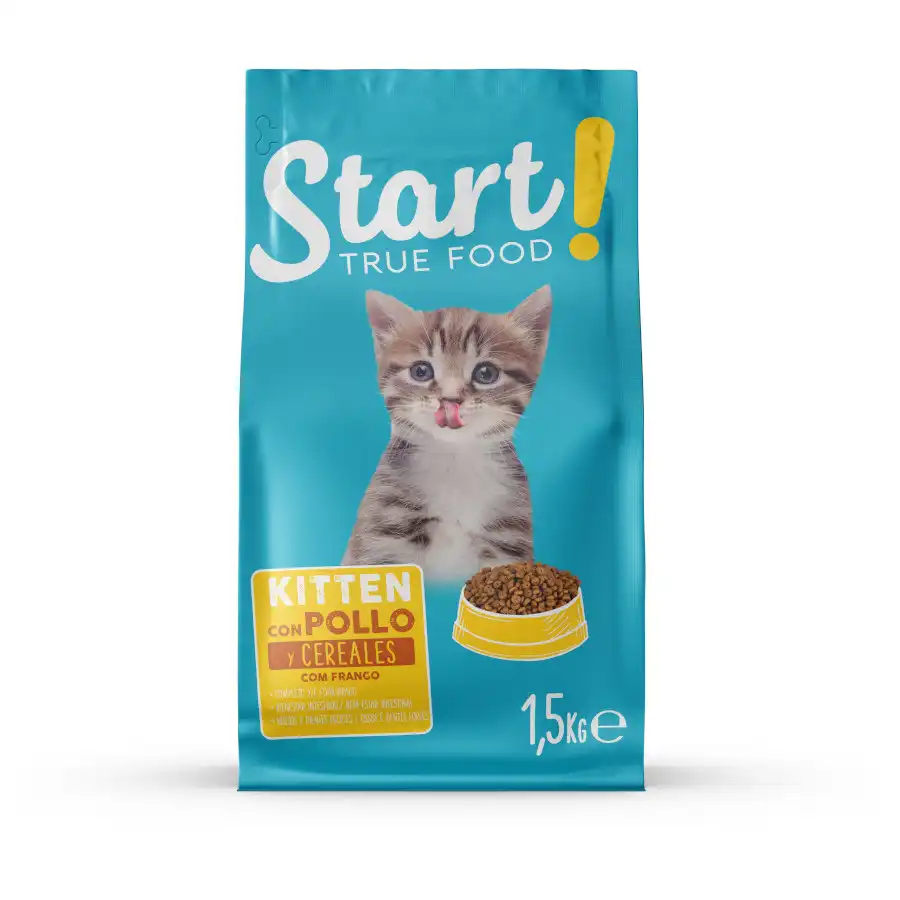 Pienso rico en vitaminas y minerales para gatitos Garantizar una alimentación saludable y deliciosa a tu pequeño felino en crecimiento, es la clave para que disfrute de un desarrollo en perfecto estado de forma, fuerte y con mucha energía, el pienso para gatitos de Start! te ayudará con eso y mucho más. Se trata de una receta deliciosa que mezcla pollo con cereales en unas croquetas adaptadas a la mandíbula de tu mascota brindarle un alimento delicioso que le encantará tener en su comedero. Esta receta es ideal para ofrecer a tu gatito en crecimiento hasta los 12 meses ya que garantiza una alimentación completa y equilibrada que satisfará todas sus necesidades nutricionales para promover una vida saludable y llena de vitalidad. Posee un gran contenido de vitaminas y minerales que promueven un desarrollo en óptimas condiciones para que tu felino se mantenga activo y muy fuerte durante su crecimiento. Incluye aceite de salmón que beneficia la salud de la piel y contribuye con un pelaje brillante; antioxidantes naturales para fortalecer el sistema inmunológico y crear una resistencia ideal frente a posibles enfermedades y contiene taurina, ideal para favorecer la buena salud de la vista el corazón de tu pequeño felino. Start! ha creado este pienso para gatos con ingredientes de la más alta calidad para ofrecer a tu mascota una dieta saludable, nutritiva y de óptimo sabor. La carne de pollo es rica en proteínas, perfecta para aportar energía a tu felino para mantenerse activo en su día a día. Además, es libre de azúcares añadidos. Características: Pienso para gatitos hasta los 12 meses. Favorece un crecimiento fuerte y saludable. Desarrollo en óptimas condiciones. Cuida la piel y promueve un pelaje brillante. Fortalece el sistema inmunológico. Favorece la salud de la vista y del corazón. Aporta energía. Garantiza una vida saludable y llena de vitalidad. Dieta completa y equilibrada. Delicioso sabor a pollo mezclado con cereales. Croquetas adaptadas a la mandíbula de tu pequeño felino. No contiene azúcares añadidos. Elaborado con ingredientes de alta calidad. Descripción nutricional: Ingredientes: carnes y subproductos animales (pollo 26%), cereales (arroz 14%, maíz 14%), aceites y grasas (1% aceite de salmón), pescados y subproductos de pescado (4%), verduras (4% guisantes), sustancias minerales, levaduras (500 mg/kg). Componentes analíticos: proteína 32%, contenido de grasa 20%, fibra bruta 1,50%. Aditivos nutricionales: Vitamina A 25.000 UI, Vitamina D-3 2.000 UI, Vitamina E 150 mg, Taurina 500 mg. Oligoelementos: Cobre (Sulfato de Cobre (ll) pentahidratado) 20 mg, Hierro (sulfato de hierro (ll) monohidratado) 100 mg, Yodo (Yodato de calcio anhidro) 2,5 mg, Manganeso (Óxido de manganeso (ll)) 40 mg, Cinc (Óxido de cinc) 130 mg, Selenio (Selenito de sodio) 0,3 mg. Antiaglomerantes: Sepiolita 545 mg. Antioxidantes. USO Y ESPECIFICACIONES: Pienso para gatitos, adecuado para ofrecer a tu mascota una alimentación completa y equilibrada