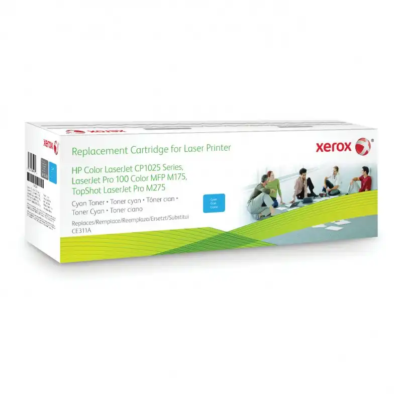 Los cartuchos de tóner Xerox para impresoras HP ofrecen una brillante calidad de imagen y fiabilidad excelente a un precio asequible. En comparación con los cartuchos de tóner original HP obtendrá de media un rendimiento de páginas 10 % superior pagará menos y recibirá una garantía 100 % de por vida. Obtenga más pague menos y evite problemas. La satisfacción está garantizada. Especificaciones: Características Tecnología de impresión: Impresión láser Compatibilidad: HP Colour LaserJet CP1025 HP Colour LaserJet 100 M175 MFP Cantidad por paquete: 1 unidad Rendimiento de impresión de tóner de color: 1100 páginas Tipo: Compatible Colores de impresión: Cian Marca compatible: HP Código OEM: CE311A Certificación: ISO_IEC_STD_19798 Condiciones ambientales Intervalo de temperatura operativa: 10 - 32 °C Intervalo de humedad relativa para funcionamiento: 20 - 80% Intervalo de temperatura de almacenaje: -20 - 40 °C Intervalo de humedad relativa durante almacenaje: 10 - 90% Peso y dimensiones Ancho: 105 mm Profundidad: 300...